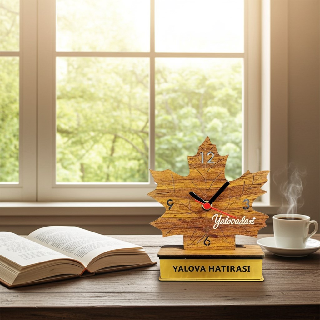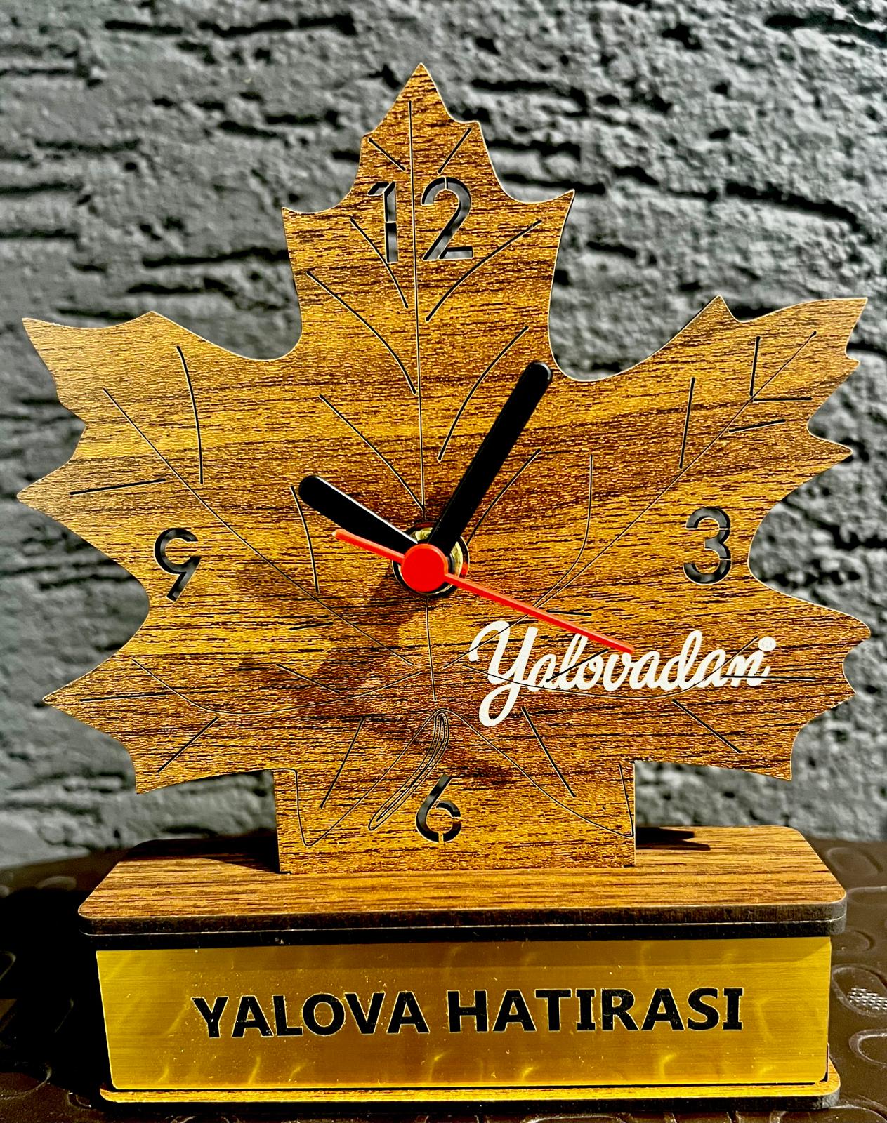 YALOVADAN ÇINAR YAPRAKLI AHŞAP SAAT EBATLAR : YÜKSEKLİK 17 GENİŞLİK 13 CM YALOVA HATIRASI PLEKSİ YAZI